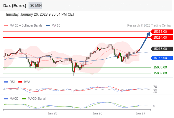 如跌破 15148 ,德国DAX指数期货 (Eurex) 目标方向定在 15080 和 15039 。