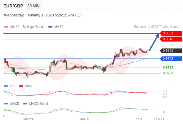 欧元/英镑 当日内: 看涨,当 0.8803 为支撑位,目标定在0.8861。