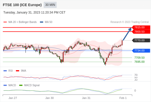 如跌破 7734 ,英国富时100指数期货 目标方向定在 7709.50 和 7695 。