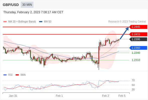在 1.2360 之上,看涨,目标价位为 1.2415 ,然后为 1.2445 。