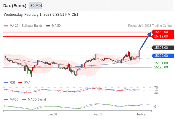 如跌破 15229 ,德国DAX指数期货 (Eurex) 目标方向定在 15161 和 15120 。