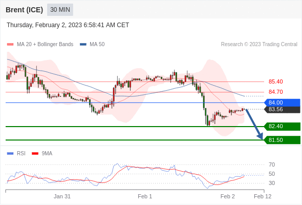 布伦特原油 (ICE)? (J3)? 当日内: 短期关键阻力位在84.00。