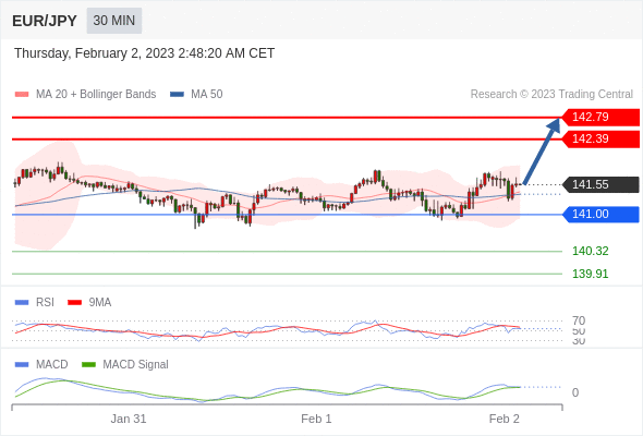 欧元/日元 当日内: 看涨,当 141.00 为支撑位。