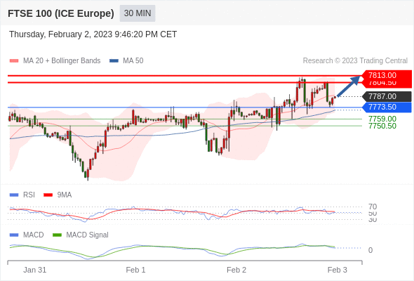 看涨,当 7773.50 为支撑位,目标定在7813。