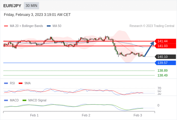 欧元/日元 当日内: 有上涨的可能,目标价位定在 141.44 。