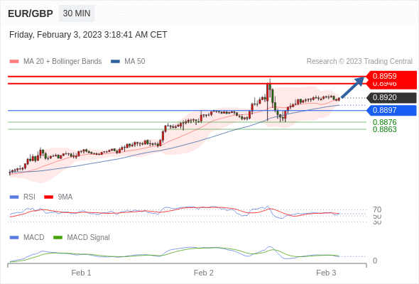 如跌破 0.8897 ,EUR/GBP 目标方向定在 0.8876 和 0.8863 。