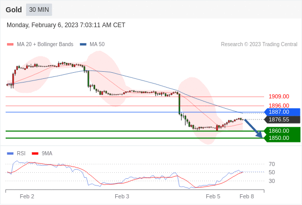 在 1887.00 之下,看跌,目标价位为 1860.00 ,然后为 1850.00 。