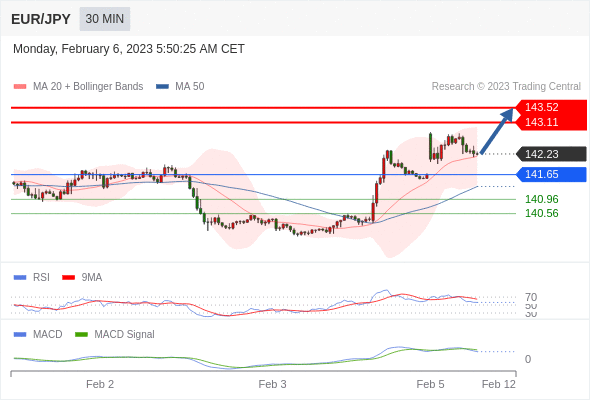 欧元/日元 当日内: 看涨,当 141.65 为支撑位,目标定在143.52。