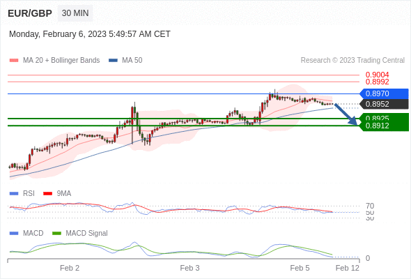 欧元/英镑 当日内: 逐渐下跌,当 0.8970 阻碍上行,则 0.8912 为目标位。