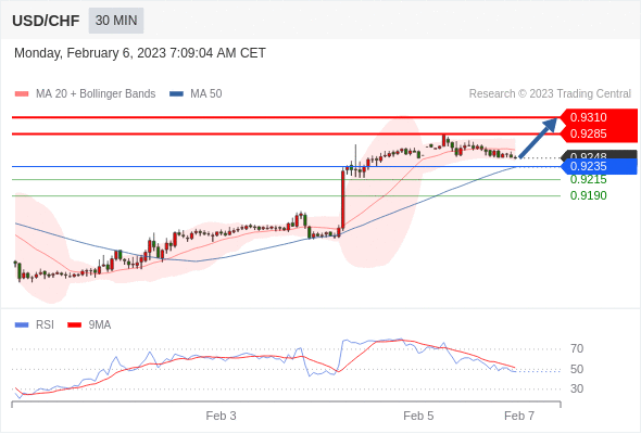 在 0.9235 之上,看涨,目标价位为 0.9285 ,然后为 0.9310 。