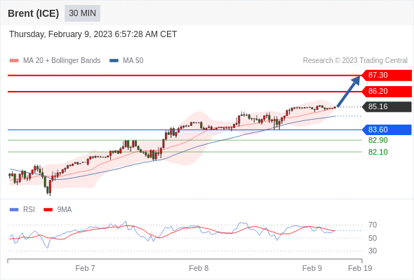 布伦特原油 (ICE)? (J3)? 当日内: 目标位为87.30。