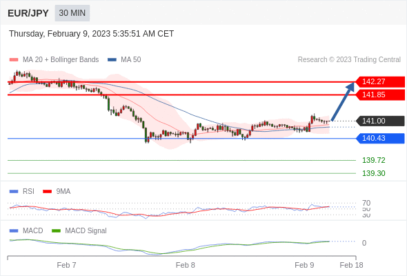 欧元/日元 当日内: 看涨,当 140.43 为支撑位。