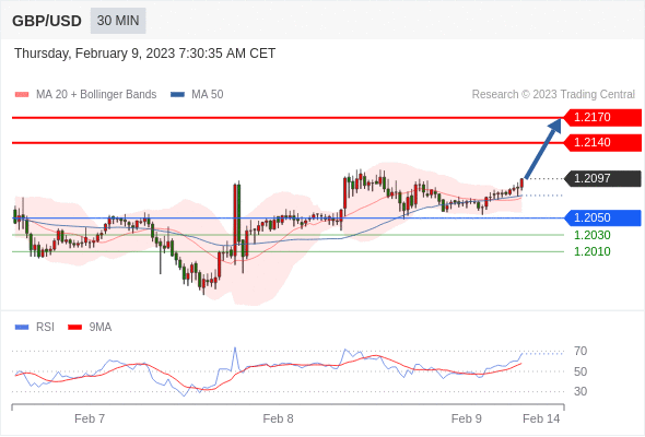 在 1.2050 之上,看涨,目标价位为 1.2140 ,然后为 1.2170 。
