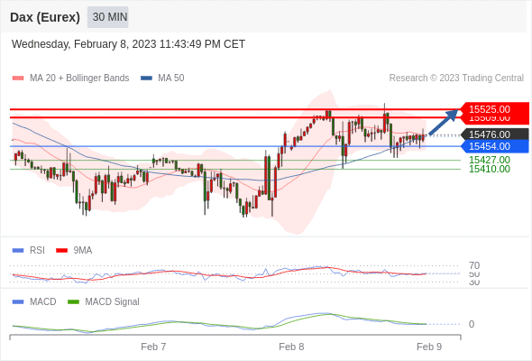 德国DAX指数期货 (Eurex)? 当日内: 调整至 15454.00 处,在反弹上升之前。