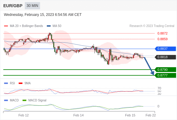 RSI技术指标低于50。 MACD技术指标呈现看跌状态并 处在其信号线的下方。 此外,价位处在其20天及50天移动平均线下方 ( 当前是 0.8820 和 0.8822 )。