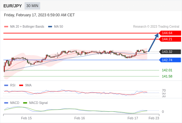 欧元/日元 当日内: 看涨,当 142.74 为支撑位。