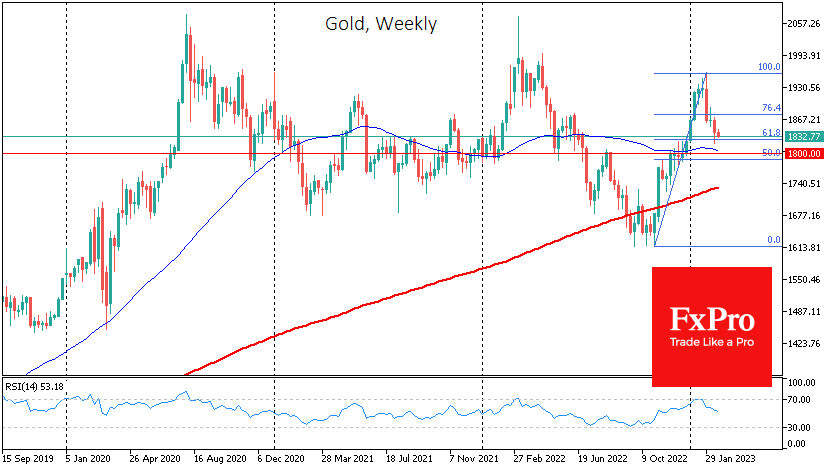 有必要对这样一个事实有所准备:黄金的下跌已经停止,但尚未结束。直到1775-1800美元区域,我们没有看到任何重大的下跌障碍。突破这个区间也会让超买的相对强弱指数完全修正。尤其是去年,黄金价格在1800美元附近几度反转。
