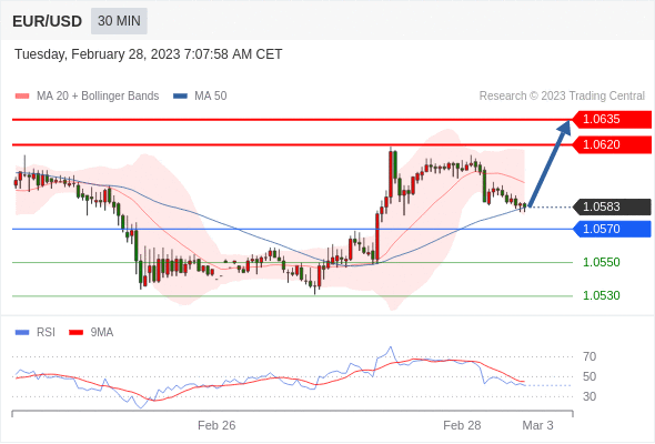 在 1.0570 之上,看涨,目标价位为 1.0620 ,然后为 1.0635 。