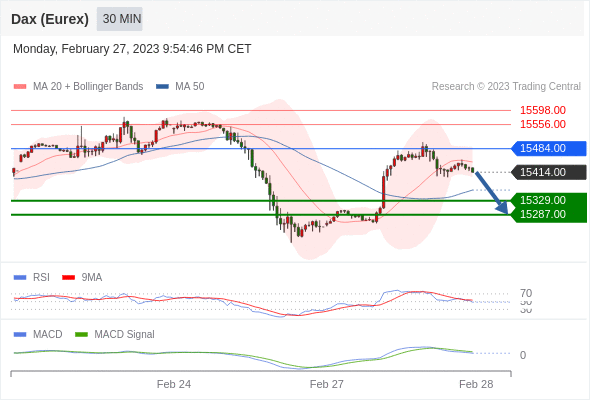 德国DAX指数期货 (Eurex)? 当日内: 逐渐下跌,当 15484.00 阻碍上行,则 15287.00 为目标位。