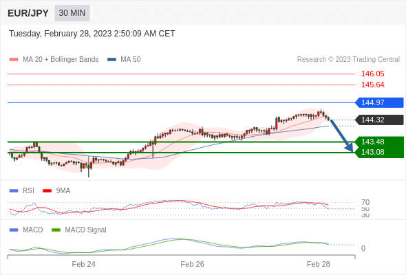 欧元/日元 当日内: 逐渐下跌,当 144.97 阻碍上行,则 143.08 为目标位。