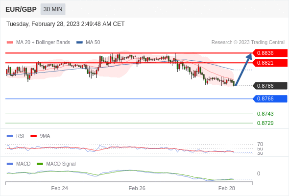 欧元/英镑 当日内: 有上涨的可能,目标价位定在 0.8836 。