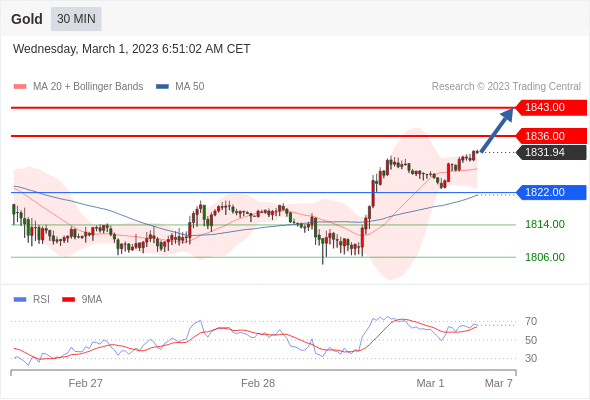 在 1822.00 之上,看涨,目标价位为 1836.00 ,然后为 1843.00 。