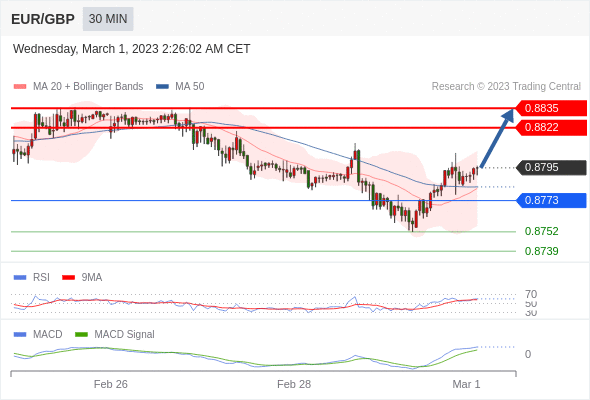 欧元/英镑 当日内: 看涨,当 0.8773 为支撑位。