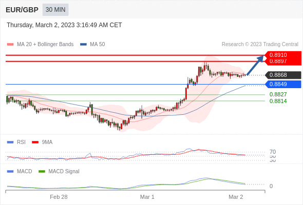 欧元/英镑 当日内: 看涨,当 0.8849 为支撑位,目标定在0.8910。