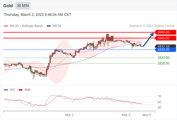 在 1830.00 之上,看涨,目标价位为 1840.00 ,然后为 1845.00 。