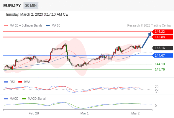 欧元/日元 当日内: 看涨,当 144.67 为支撑位,目标定在146.22。