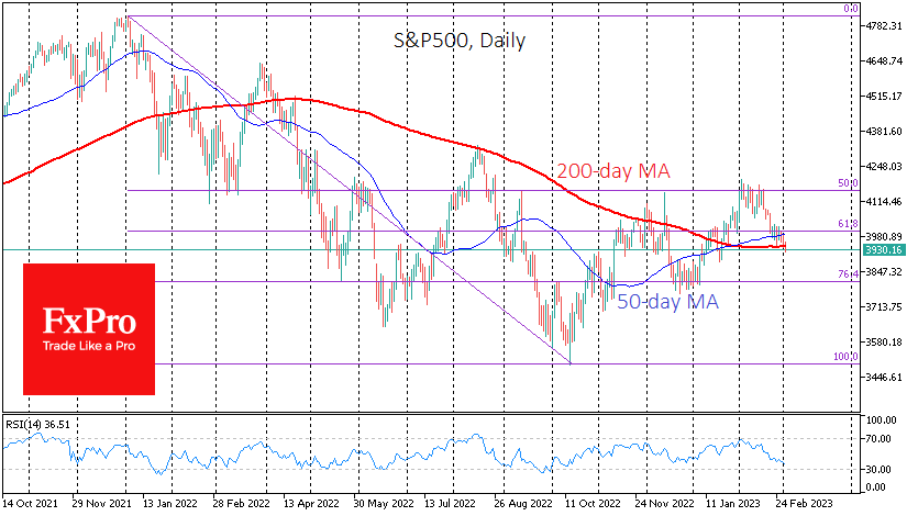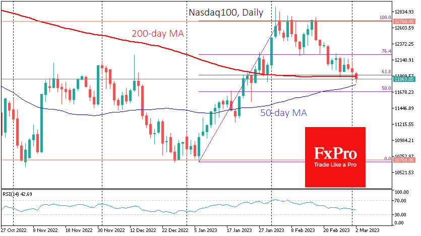 FxPro高级分析师Alex?Kuptsikevich指出:纳斯达克100指数期货今日早间跌至11850点,为一个多月以来的低点,空头从1月初低点到一个月前高点的涨幅缩水了一半。更引人注目的是,该指数自周三晚间以来一直在测试200日移动均线的支撑位,目前已低于该水准。