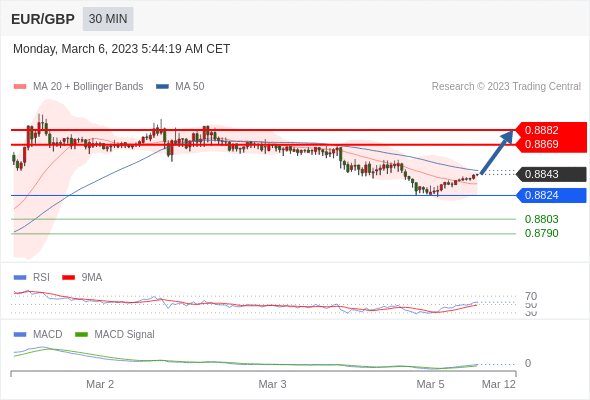 RSI技术指标大于中性区域50。 MACD技术指标处在其信号线之上 看空。 另外,价位低于其50天移动平均线 ( 0.8846 ) 但高于其20天移动平均线 ( 0.8834 )。