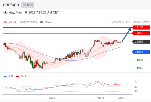 在 1.1995 之上,看涨,目标价位为 1.2075 ,然后为 1.2100 。