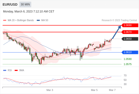 在 1.0610 之上,看涨,目标价位为 1.0670 ,然后为 1.0690 。