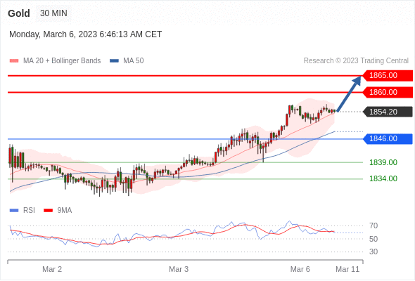 在 1846.00 之上,看涨,目标价位为 1860.00 ,然后为 1865.00 。