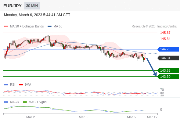 欧元/日元 当日内: 看跌,在 144.78 之下。