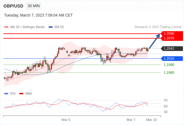 在 1.2010 之上,看涨,目标价位为 1.2075 ,然后为 1.2090 。