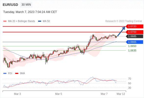 在 1.0665 之上,看涨,目标价位为 1.0700 ,然后为 1.0720 。
