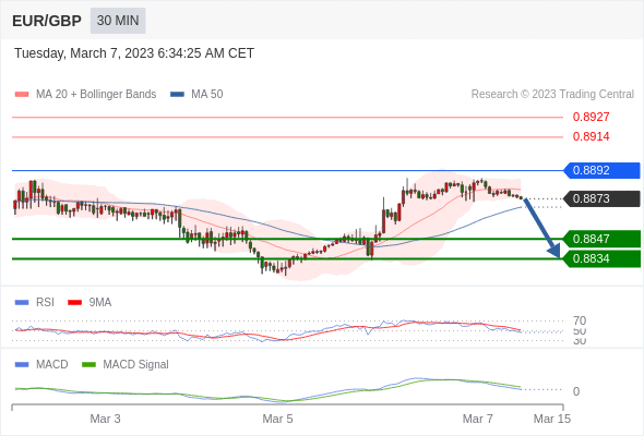 欧元/英镑 当日内: 逐渐下跌,当 0.8892 阻碍上行,则 0.8834 为目标位。