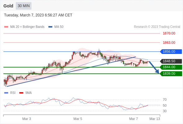 在 1856.00 之下,看跌,目标价位为 1844.00 ,然后为 1839.00 。
