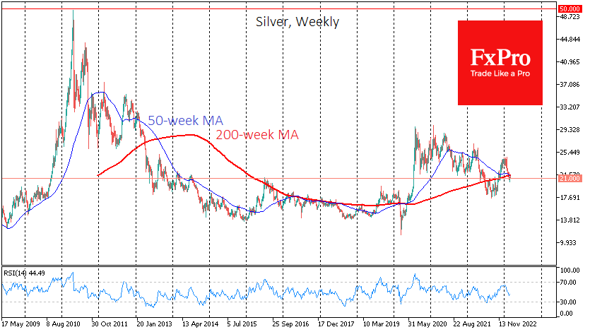上月底,银价跌至每盎司21.0美元时,白银开始回购。这一水平在去年也曾多次作为支撑位(5月和11月)和阻力位(8月和10月)。白银在2014年和2016年也保持在这一水平之上,加强了这一领域的重要性。在我们的情况下,白银可能会在这里找到长期下行支撑,或者迅速逆转上行。