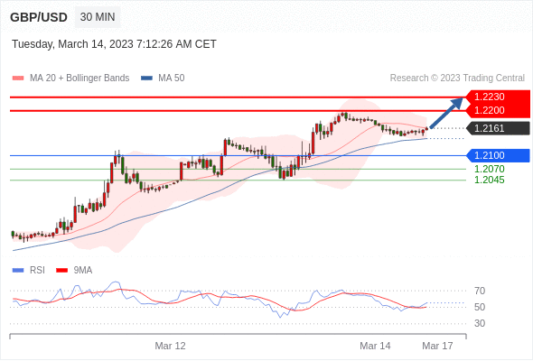 在 1.2100 之上,看涨,目标价位为 1.2200 ,然后为 1.2230 。