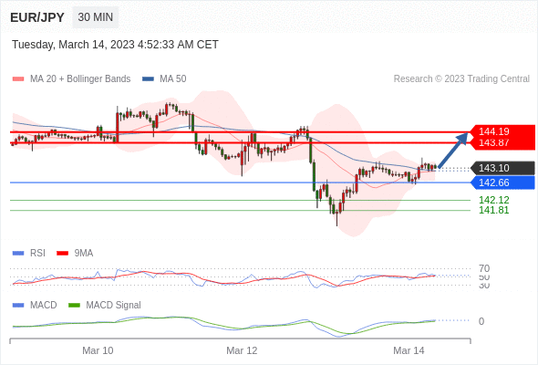 欧元/日元 当日内: 看涨,当 142.66 为支撑位。