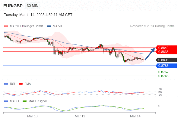 欧元/英镑 当日内: 有上涨的可能,目标价位定在 0.8849 。