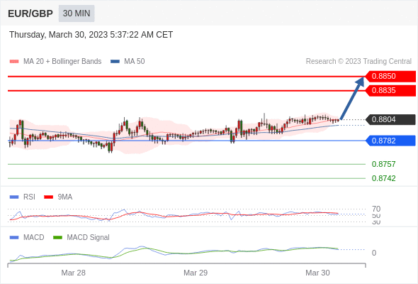欧元/英镑 当日内: 看涨,当 0.8782 为支撑位,目标定在0.8850。