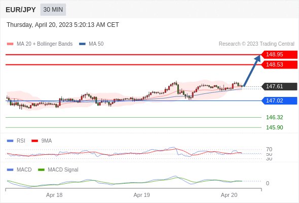 欧元/日元 当日内: 看涨,当 147.02 为支撑位。