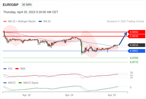 欧元/英镑 当日内: 看涨,当 0.8801 为支撑位。