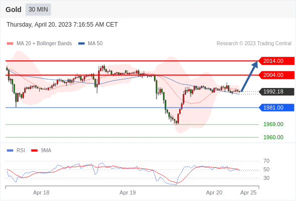 黄金现货 当日内: 在1981.00之上,看涨。