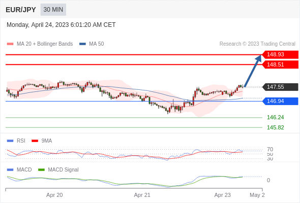 欧元/日元 当日内: 看涨,当 146.94 为支撑位。