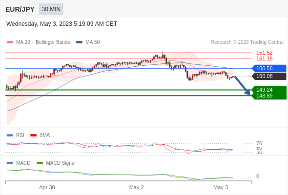 欧元/日元 当日内: 看跌,在 150.56 之下。